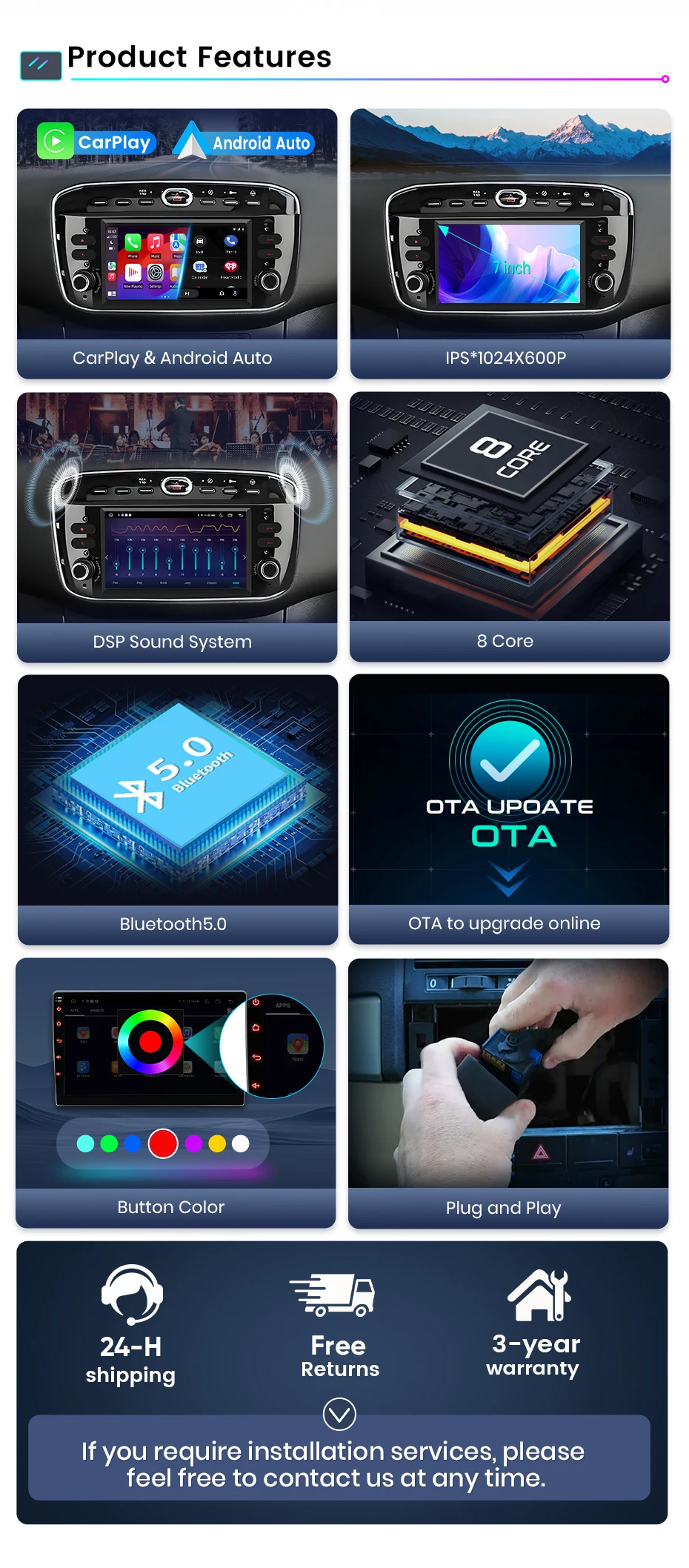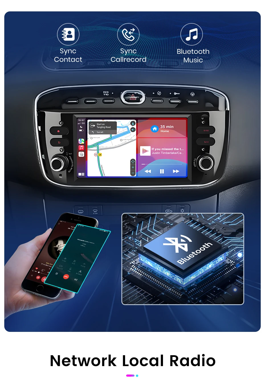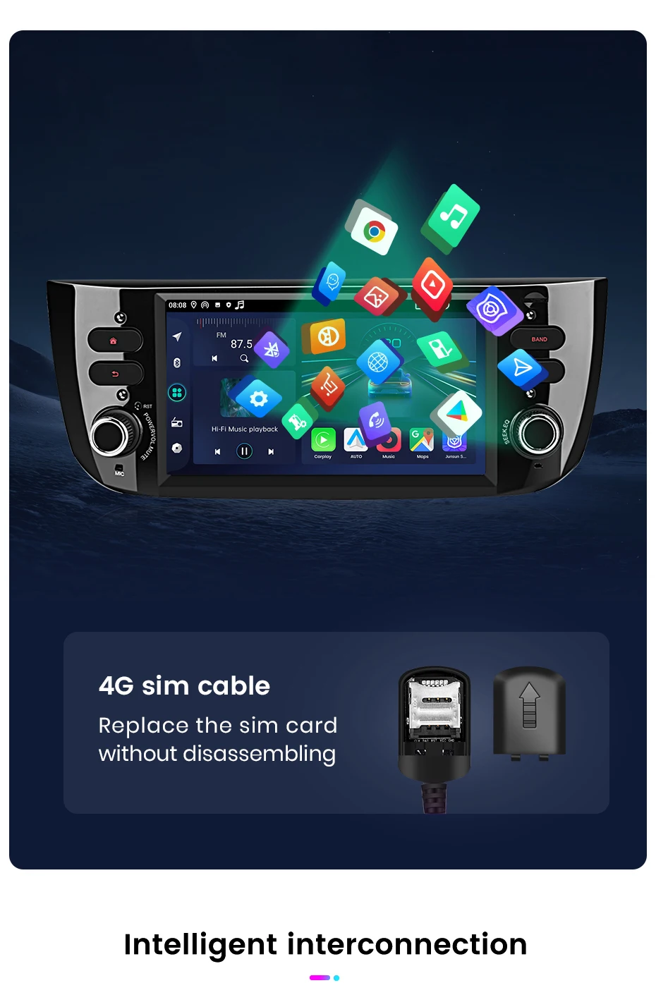 1024*600 ultra-high resolution High-definition capacitive screen running fast radio player Carplay/Android Auto can be connected both wired and wirelessly for a safe and enjoyable riding experience.