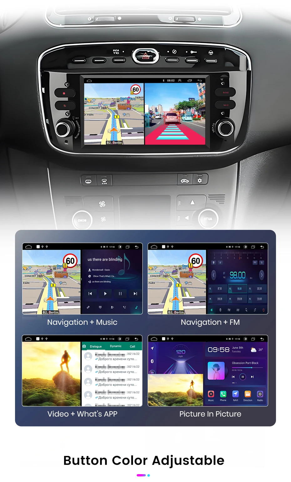 The left and right screens can be separated with any applications, e.g. navigation for the main driver, playing video for the passenger, or one side listening to music and other side turning on ADAS dvr functions Choose the color as you like.